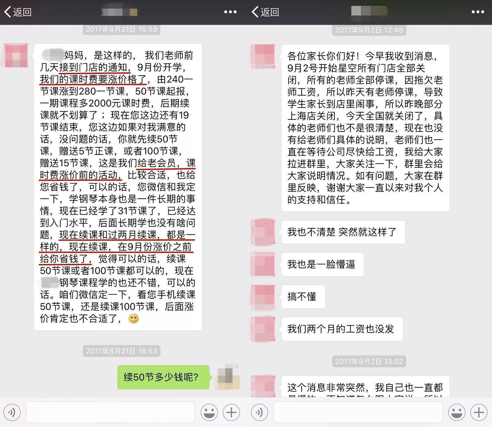 北京的受害者家长说,在跑路前12天,也就是2017年8月底,星空通知家长们9月份开学要涨价,催促已经买课的家长们,立即再续一笔课时费。