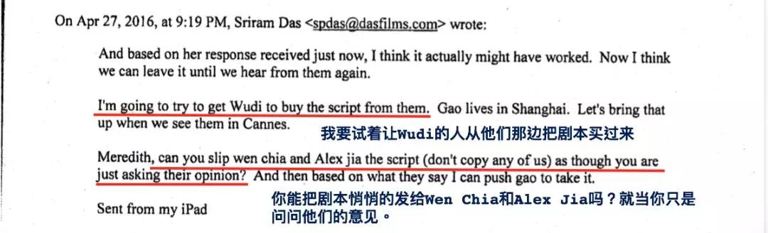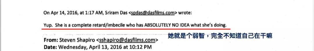据范雪铮介绍,这位Das公司实际上是一家只有几个人的小制片公司,Das操盘过的电影项目并不多。而仲裁公布的Das跟内部员工的沟通邮件更显示,这位印度裔美国人多次表达对华人傲慢与歧视的态度。