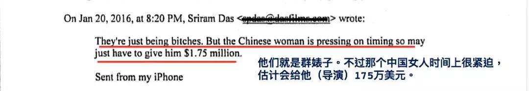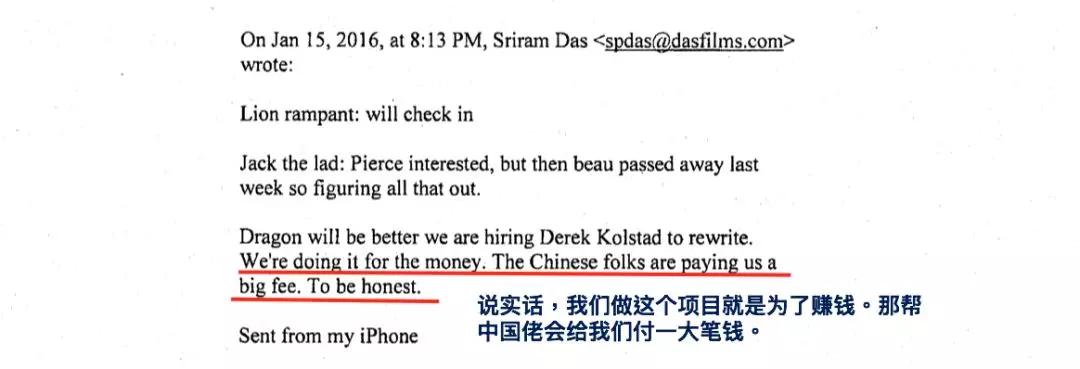 Das Films还在邮件中声称,“我们做这个项目就是为了赚钱,那帮中国佬会给我们付一大笔钱。”