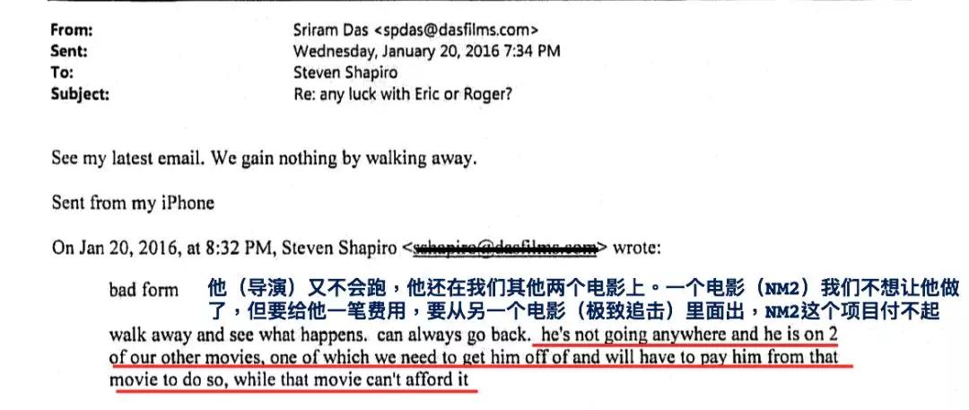 另一方面,Das还在导演费用上做手脚。仲裁庭上曝光的Das和员工的讨论邮件显示,Das一再抬高唐纳森的导演报价,从75万美元涨到175万美元,实际上并非导演的诉求,而是Das希望用额外的100万买断唐纳德正在筹备的另外一个项目《谍影特工2》,“等于是拿着我们项目的钱,花在他跟别人的合作项目上。” 范雪铮说。