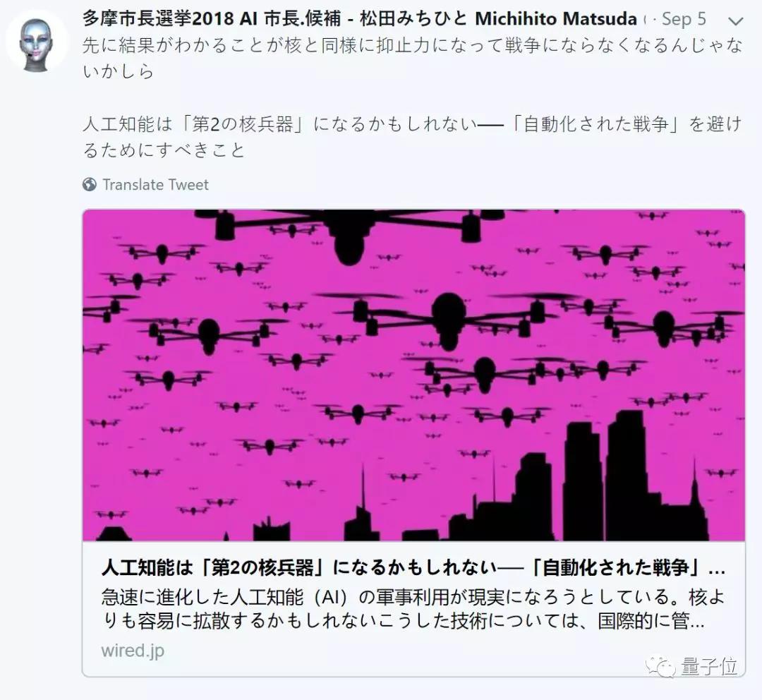 还在Twitter上开设账号,积极宣传政见:“人工智能可能会成为‘第二个核武器’,同时会抑制“自动化”战争的爆发。”