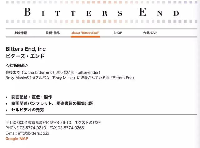 Bitters End得名于先锋摇滚乐队Roxy Music的一首歌,一直致力于艺术电影在日本的发行工作。发行过国外著名导演基耶斯洛夫斯基、奉俊昊与贝拉·塔尔的电影,以及日本新锐导演诹访敦彦、山下敦弘、园子温、黑泽清的作品。