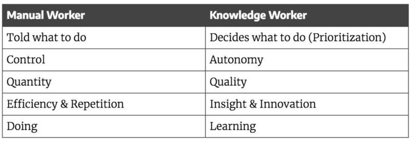 德鲁克关于影响知识工作者生产力因素之所以特别有趣,有两方面的原因。 首先,几乎所有的因素都与影响手工劳动者生产力的因素完全相反。 其次,现在许多知识工作者仍然把他们的职业生涯组织得更像体力劳动者,几乎只关注效率、努力工作和高产出。