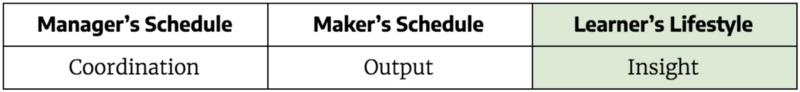 简而言之,学习者的日程优化了对协调和输出的洞察力。经理的日程主要是关于协调的,制造者的日程主要是关于产出的,而学习者的日程主要是关于洞察力的。