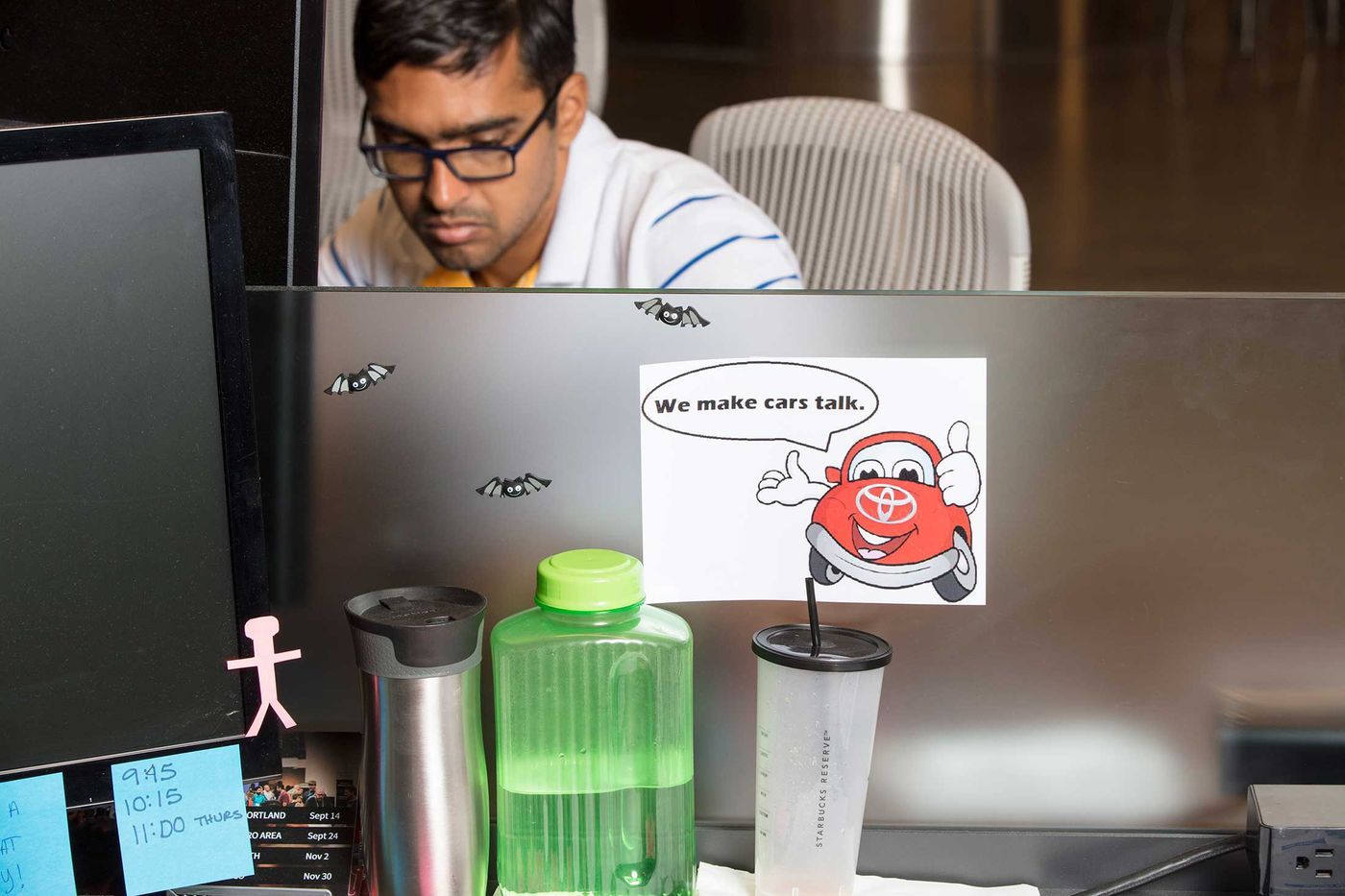 Hicks和他在Connected臭鼬工厂年轻的程序员小组正在尝试创建一个超级智能的车轮上的web浏览器。每200毫秒他们就可以上传来自丰田数百万辆联网汽车的500个传感器的数据——这样下来每天每辆车都会有超过700万的数据点。这些传感器测量的指标包括速度、位置、制动压力、转向角、燃油油位、胎压以及数百个其他的指标,比方司机踩刹车是否比大多数人更用力等。