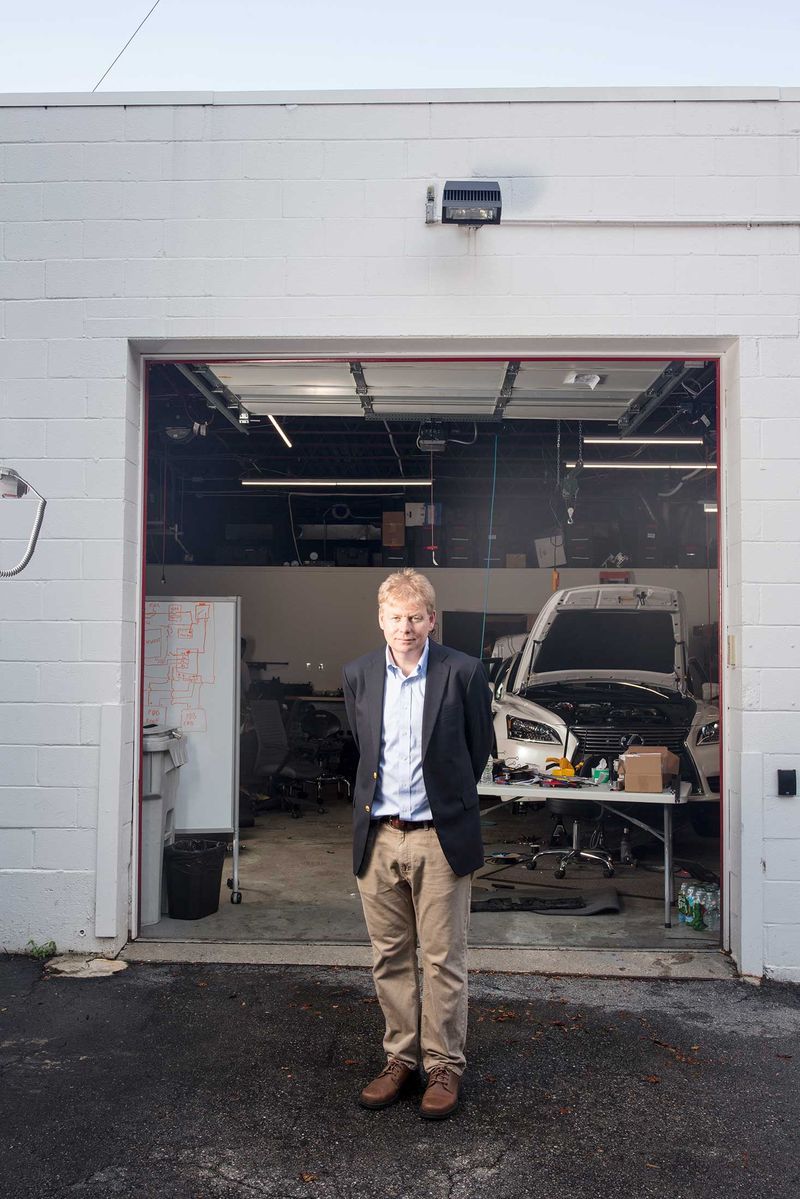 John Leonard站在丰田研究所MIT车库的前面,背后是被拆解的雷克萨斯
