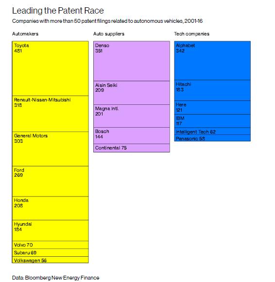 2001-16年间申请汽车相关专利超过50项的公司,丰田是专利比赛的领跑者