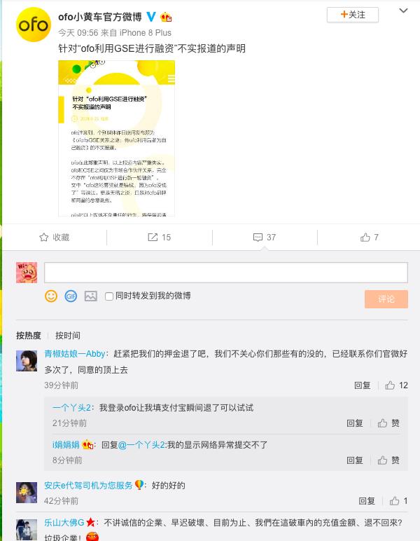 不过值得注意的是,ofo 这条微博下的用户留言,多是在要求 ofo 将押金退还一事。