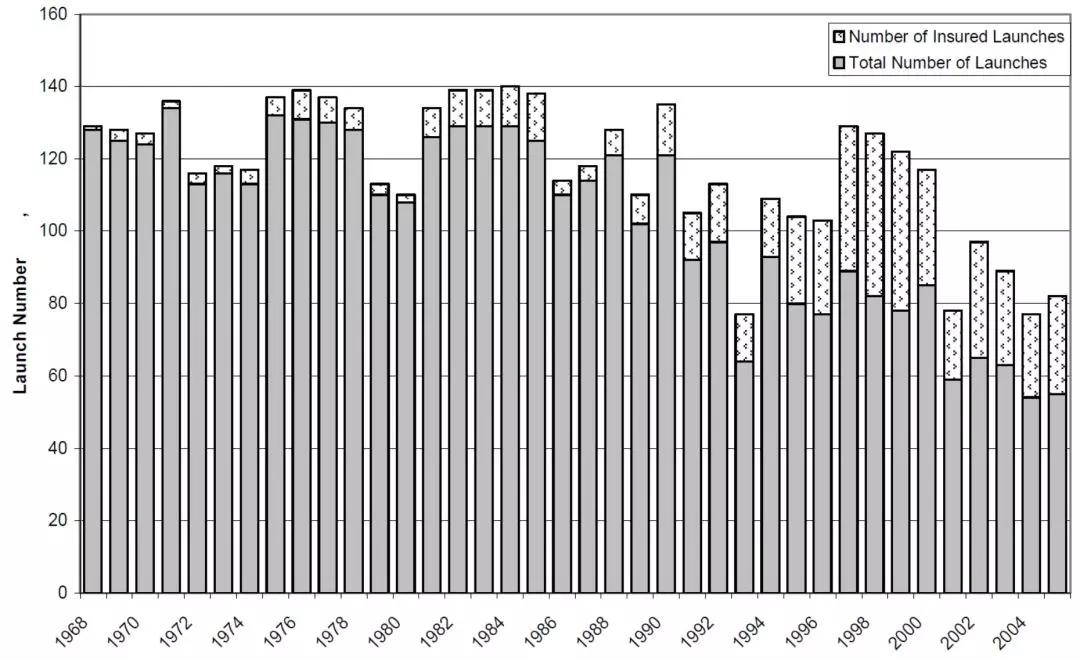 从Manikowski在2010年整理的世界航天发射次数与进行保险次数对比可以看出,进行保险的发射数量在80年代有了较为明显的提升,这是由于世界航天的发展在这时逐渐开始,越来越多的卫星运营商开始为自己的发射购买保险以抵御潜在的发射失败风险,这一趋势一直延续到现在,越来越多的商业卫星运营商进入航天领域,也开始关注如何购买保险。