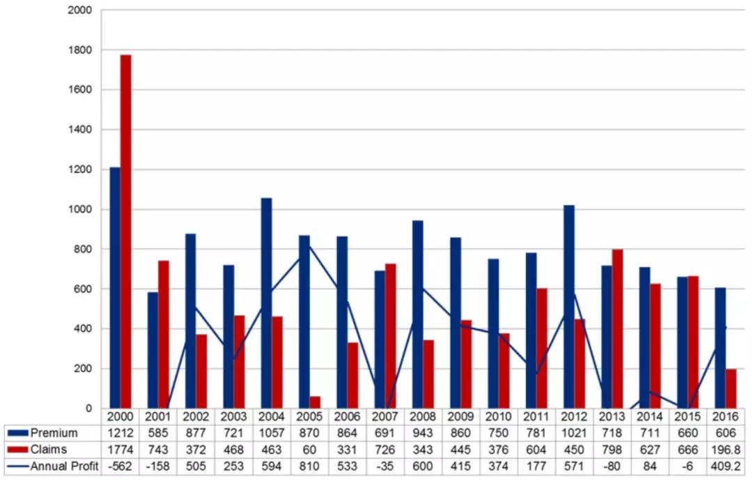 知名的国际保险公司MARSH在2017年公布了一份全球2000~2016年航天保费收入和赔款的数据图,我们可以看到这17年的数据,除了2000年、2001年、2007年、2013年、2015年这5个年份外,其他12个年份都是保费大于赔款的,而从拿到的最新的2017年数据,保费也是高于赔款。对于保险公司来说,“至暗时刻”就是下图那些Claims高于Premium的年份。