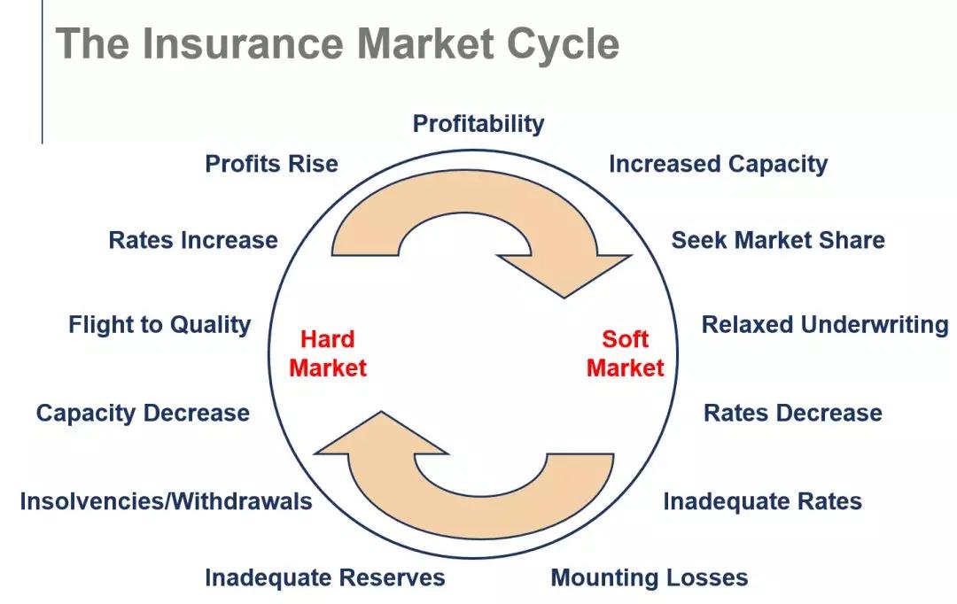 保险费率的市场周期变化如下图所示,进入相对宽松的市场周期时,保险公司承保能力增强,希望能够找到更多的市场份额,从而会降低保费费率;但当一些不期望的赔付发生后,就会导致保险公司承保能力下降,从而提升保费费率对冲风险。而这样的市场周期变化在航天市场也是存在的。