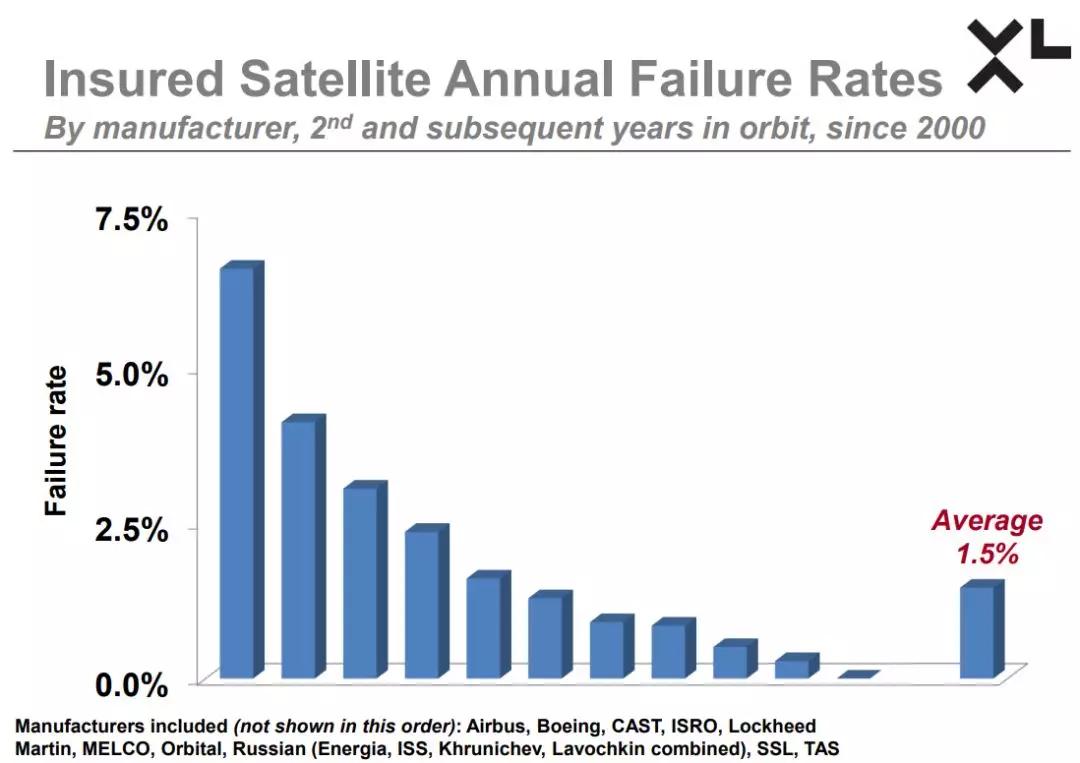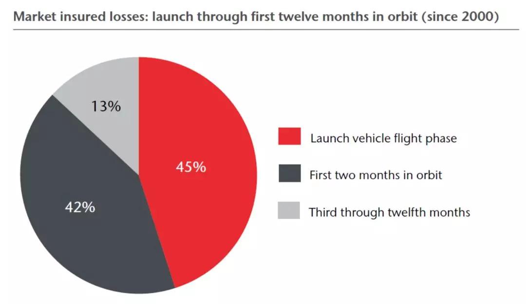 通过XL Insurance的数据来看,对于卫星出现问题的时间,除了发射过程占45%,在轨的最初两个月出现问题的比重占到了42%,也就是说如果用户购买的发射保险涵盖了轨道测试2个月的阶段,那么就能够覆盖住绝大多数(高于80%)卫星损失的可能性了。