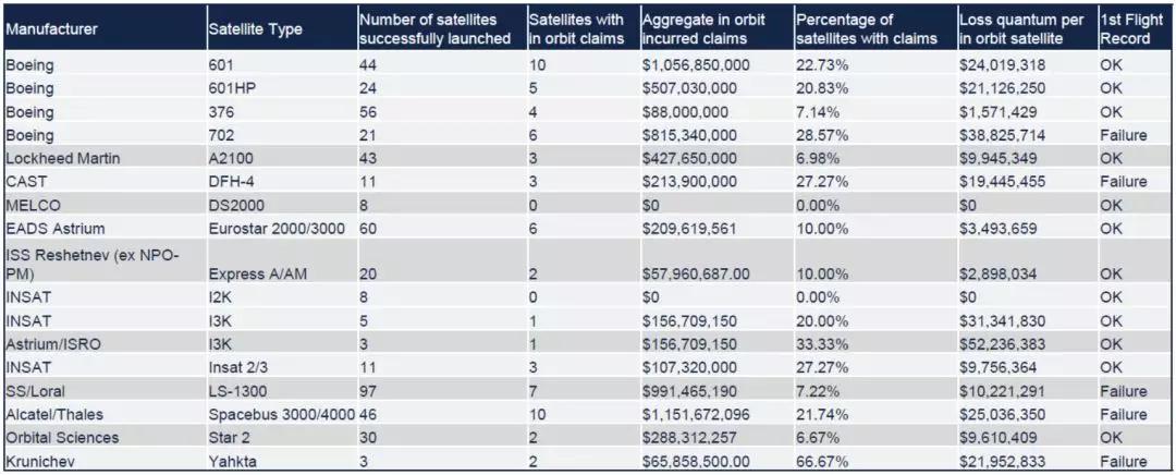 对于保险公司来说,在轨保险最重要的就是卫星平台历史数据的情况,保险经纪公司Willis在2015年的《The Space Insurance Market》中就列举了部分参保卫星平台的数据情况,从中我们可以了解到在保险服务商眼中,能够给出低保险费率的是哪些平台,从历史数据来看,SSL的卫星卖的好也是有道理的。