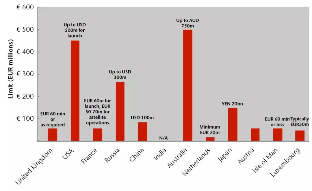 对于不同的国家对于此项保险的赔付额有一定的要求或限制,Aon统计了部分国家的赔付额要求或限制,有的国家,如美国、俄罗斯和澳大利亚,都做了赔付额上限的要求,其中澳大利亚甚至可以高达7.5亿澳币,而荷兰则要求了最低赔付额2000万欧元。