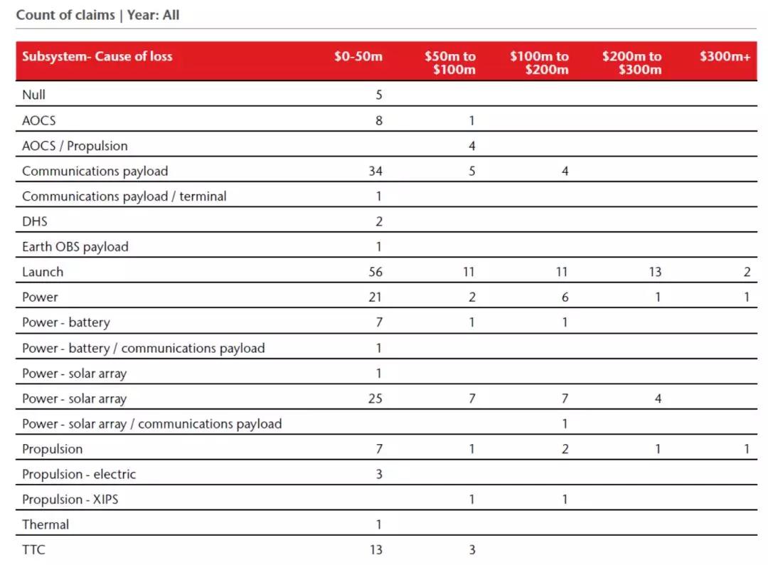 发射保险提供的是火箭发动机点火到卫星与运载火箭末级分离期间发生损失的赔偿。对于目前有统计的数据来看,发射失败是导致卫星出现损失最常见的情况,根据英国保险公司Aon的数据来看,如果把发射作为卫星的一个分系统,在其统计的共278次赔款中,发射占了93次,超过1/3。