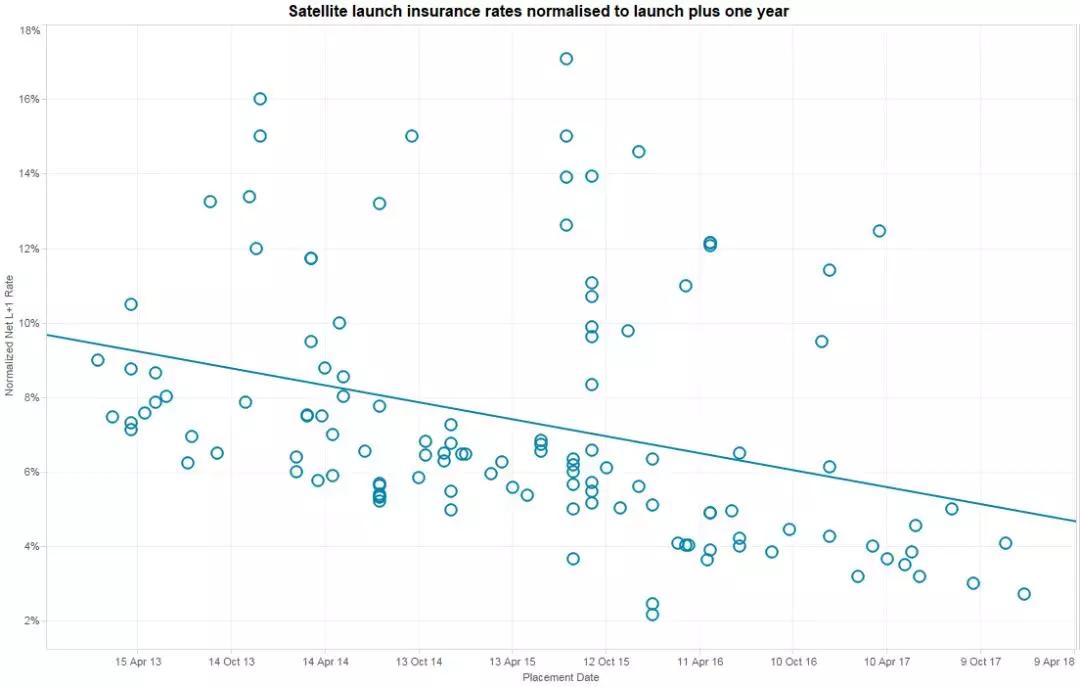近几年来发射成功率很高,同时也没有出现大的赔付,发射保险对发射服务提供商来说也迎来了最好的时代,Aon的统计数据表明,2013年后普遍的发射保险费率都低于10%,甚至在这两年已经出现了低于3%的超低发射保险费率。