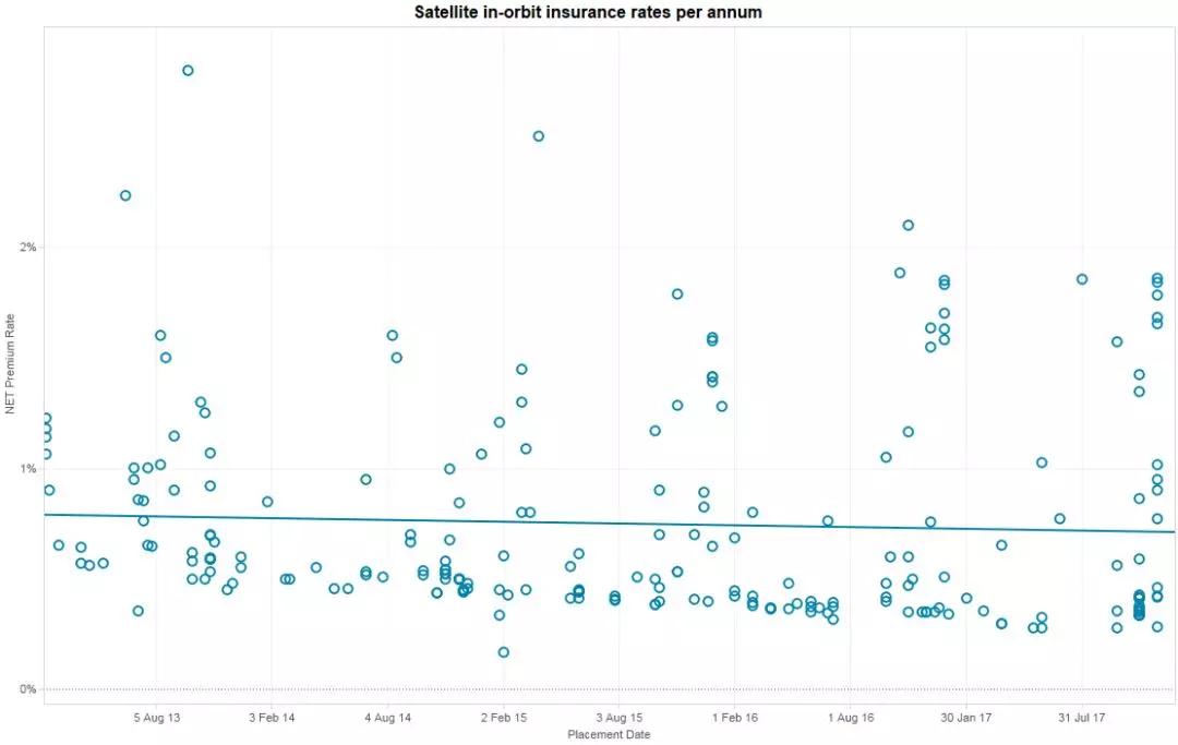 而近几年来的在轨保险费率也呈下降趋势,从Aon公司的统计数据来看,普遍的平均值已经低于1%。