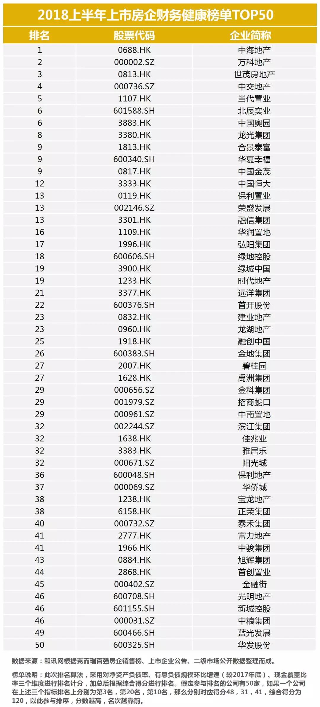 根据榜单显示,2018上半年,中海和万科的财务表现最为健康,综合排名分别为第一、第二名。
