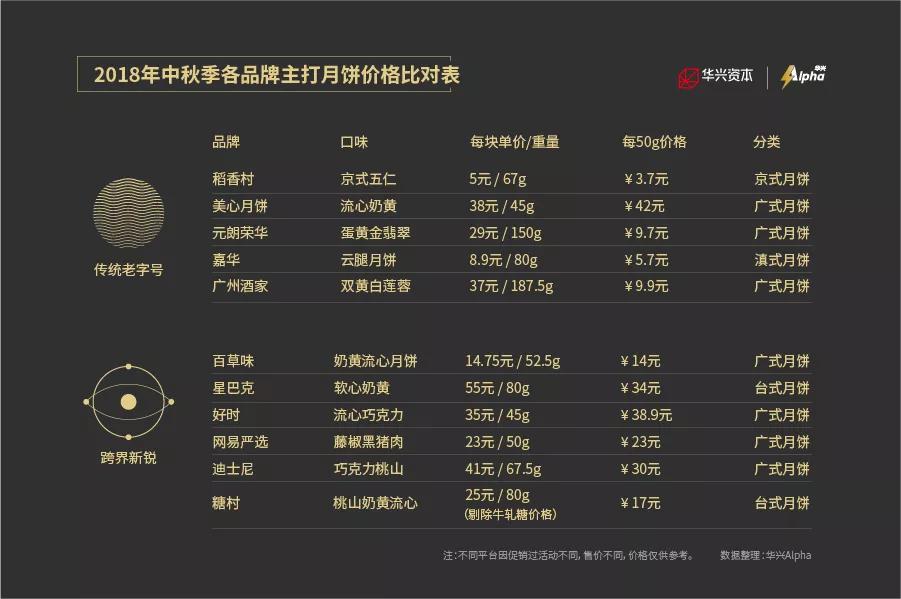 那么老字号和跨界品牌在月饼的口味、定价以及品牌营销上又有什么异同之处呢?也许下面的表格可以说明一些问题。(鉴于综合电商平台经销商过多,价格参差不齐,华兴Alpha选择了某生鲜O2O的售卖情况作为参考)