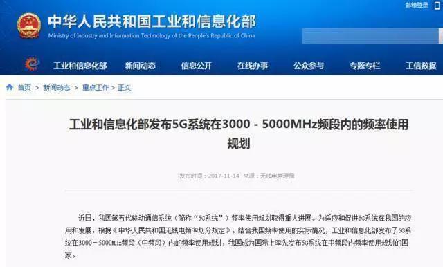中国工信部非常重视5G技术的发展。早在2017年11月9日,工信部就正式对外公布了5G系统的工作频段,使中国成为全球第一个公布5G工作频段的国家,对5G的发展起到重大的推动作用。