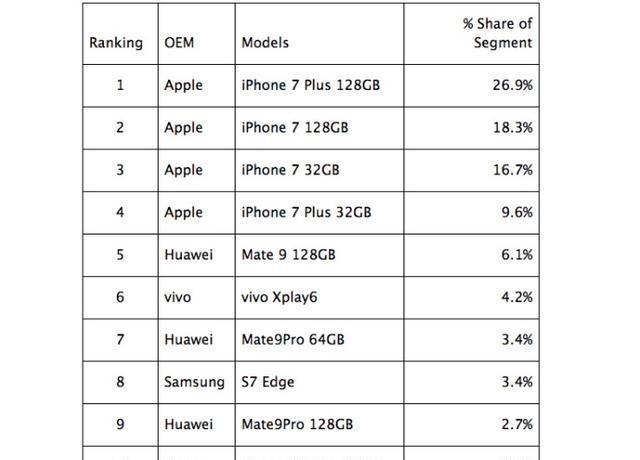 如果我们回顾几年前的4000元以上手机销量排名,基本上是苹果三星霸占榜单,国产手机少有能进入到榜单之内。而在去年第一季度Counterpoint的报告中,国产手机在4000元以上销售排名中前六名就开始冒头,占了2款,分别是华为mate9与vivo Xplay6(如下图),今年占了3款,国产手机在中高端市场这种上行的势头已经非常明显。