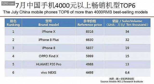 在今年7月份的一份中国手机4000元以上畅销机型TOP6榜单上,可以看出国产手机在高端市场正在逐步被认可。尽管苹果依然揽下了前三,但其中,OPPO FindX、华为P20 Pro、vivi NEXS进入榜单,分列第四、第五、第六。而排在第四位OPPO Find X,其超级闪充版售价为5999元,,基本上已经是iPhone8的价格处于同一阵营。
