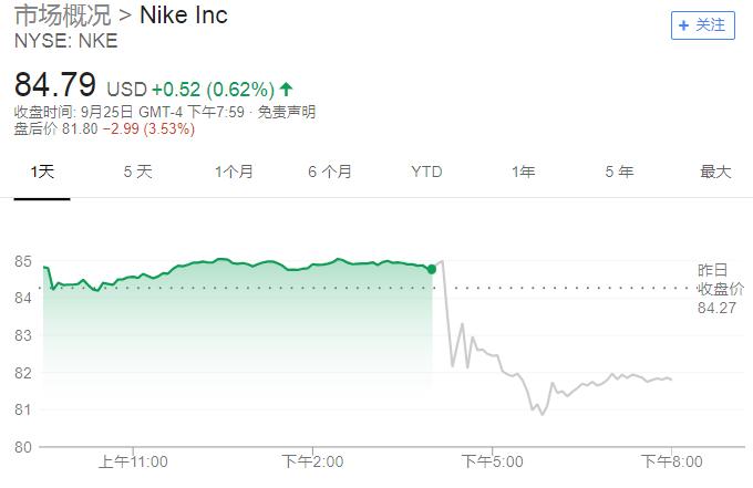 公告发布后,耐克股价(下图)盘后一度下跌4.6%,此后跌幅有所收窄。分析师将其归结于该公司毛利率不及预期——数据显示,耐克第一财季的毛利率增长了44.2%,略微低于市场预期的增长44.3%。
