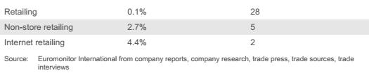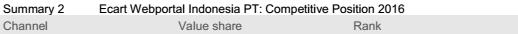 当Lazada的市场和Lazada自己的销售额合并时,Ecart Webportal Indonesia PT在2016年在印度尼西亚的互联网零售领域处于领先地位,拥有24%的价值份额,尽管该公司在2016年的零售总额仅为边际。 然而,就NBO而言,这只会考虑公司自身的销售额,并将通过市场排除第三方销售,因此公司在2015年的零售额排名第28位,零售价值份额更小。