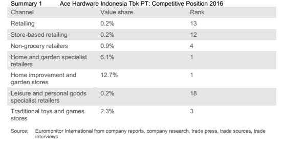 公司在2016年的零售业排名第13位,其整体价值份额仅处于边缘地位。然而,2016年,Ace Hardware Indonesia领导家居和园艺专业零售商,其价值份额为6%。同时,在传统玩具和游戏商店中,2016年保持第三的领先地位,价值份额为2%。