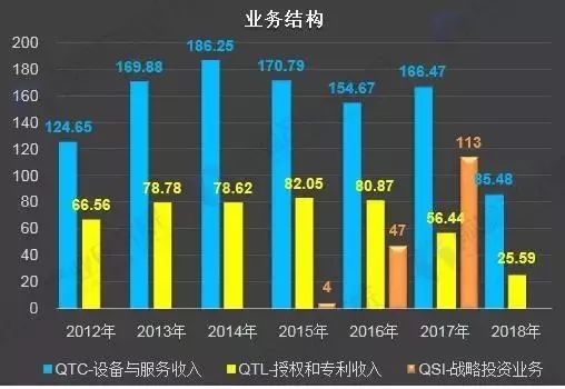 高通的主营业务分为 QCT、QTL 和 QSI 三大部分。其中,QTL 业务线(技术授权部门,主要负责对高通历年积累和收购的技术专利进行授权)贡献了相当一部分业务营收,但是 2017、2018 这两年的 QTL 收入却出现了大滑坡,从 2016 年的 80.87 百万元陡降到 2017 年的 56.44 百万元。