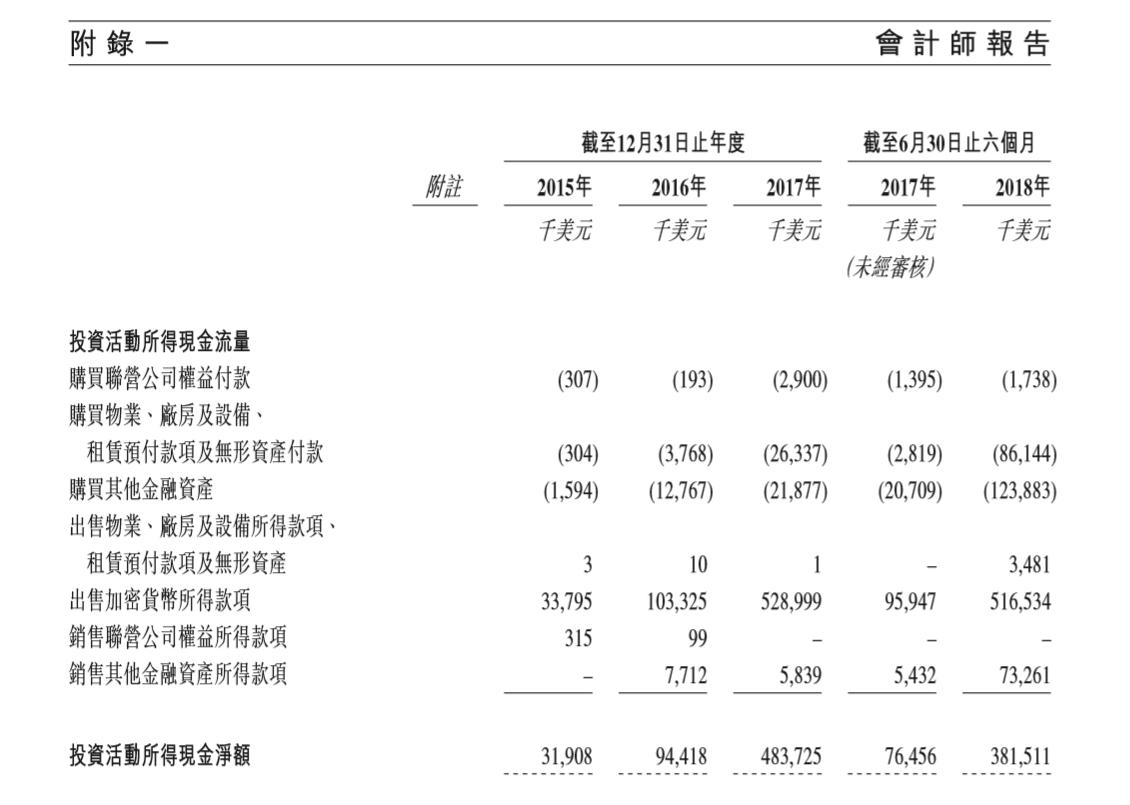 招股书显示,近年来一直盈利的比特大陆,在现金流表中的经营性现金流一直为负,原因是因为加密货币收入无法计入经营性现金流,只能计入投资活动所得现金流。2017年,比特大陆出售加密货币所得款项超过5亿美元;今年上半年同样超过5亿美元。