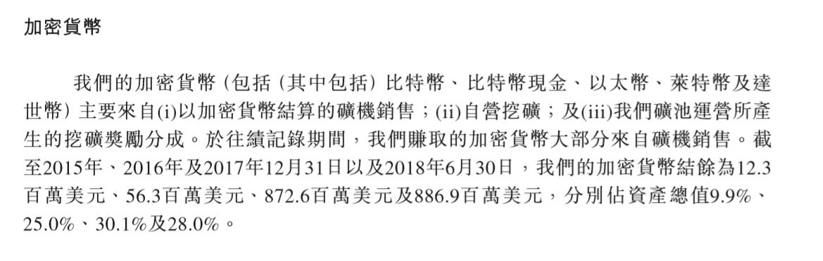 截至2017年年底,加密加密货币资产占比特大陆资产30%,截至2018年上半年持有加密货币资产共计8.9亿美元,占总资产28%,占比有所降低。比特大陆持有的币种包括 BTC、BCH、ETH、LTC和DASH。