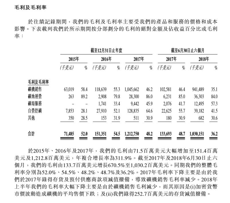 比特大陆上半年净利润超过7亿美元,但关注比特大陆的毛利率会发现其下降明显,从最初的52%到今年36%。另外各个部分业务中,矿池运营毛利率最高,也相对稳定;但是矿机销售和自营挖矿的毛利率在近两年半都有下降趋势。招股书中也有表示,上半年毛利率大幅下降主要由于矿机销售毛利降低,包括加密货币市价波动导致矿机平均售价下跌,以及录得2.5亿美元存货减值拨备。
