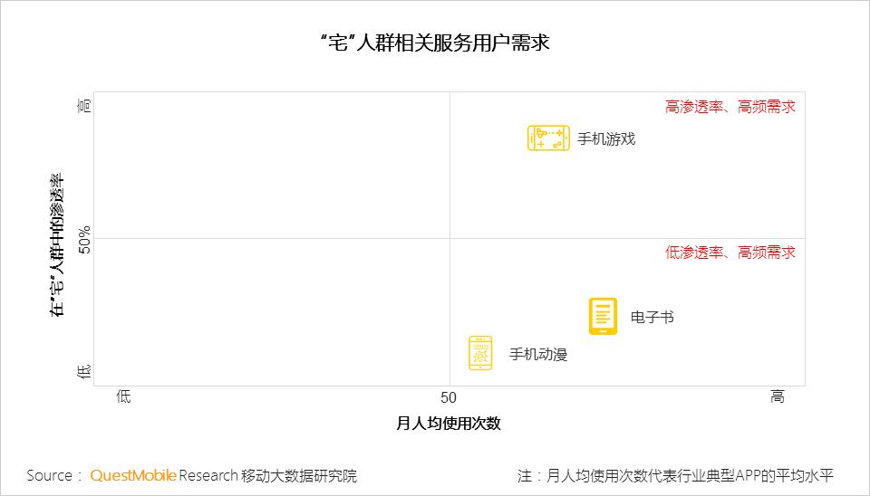 1、“宅”人群对手机游戏、电子书、手机动漫的需求频率均较高