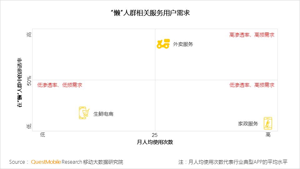 1、“懒”人群对外卖服务、家政服务的需求频率较高,生鲜电商则相对较低