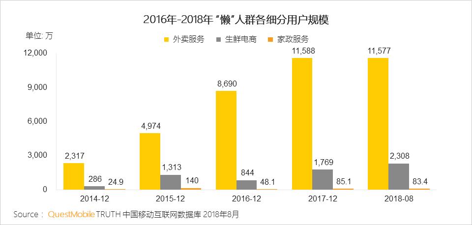 3、外卖服务和家政服务带动的“懒”人群的增长已趋缓,生鲜电商用户仍在增长,总体来说,“懒”人群对外送服务的需求显著高于上门服务。