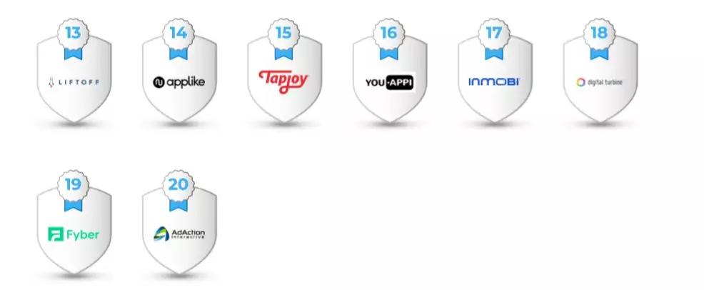 其次,Top10以外的排名变动则较大。Snapchat、Tapjoy、YouAppi、Fyber和AdAction在期内都有明显的排名提升,而applike和INMOBI则作为新晋广告平台分别排在14和17名。