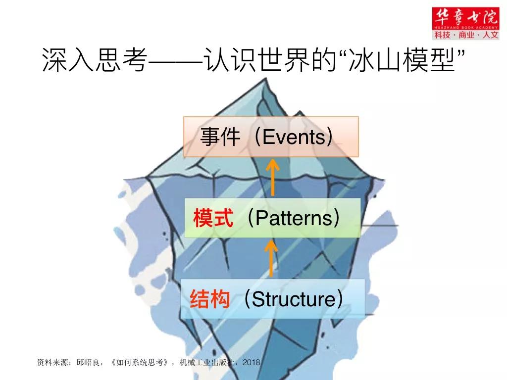 这个冰山模型实际上就是理解世界的三个层次,冰山浮在水面之上的就是我们理解事件的事件这个层面。