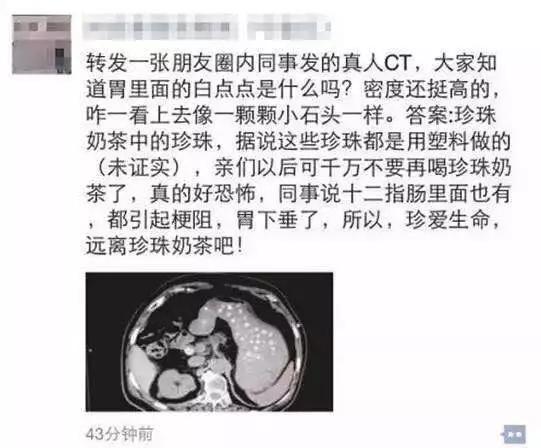 2015年,网络上曾疯传喝珍珠奶茶会造成肠梗阻,并配上了骇人听闻的标题和图片。