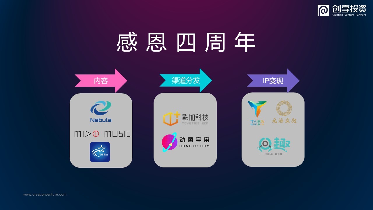 感恩四周年,我们创享投资在这个时间中不断在优化,不断成长。从去年到今年,我们投资了10家公司,覆盖内容,渠道分发,IP变现等多个领域。而今天,在四周年之际举办这场活动,就是希望可以跟大家一同交流,分享我们的经验,以及看法。