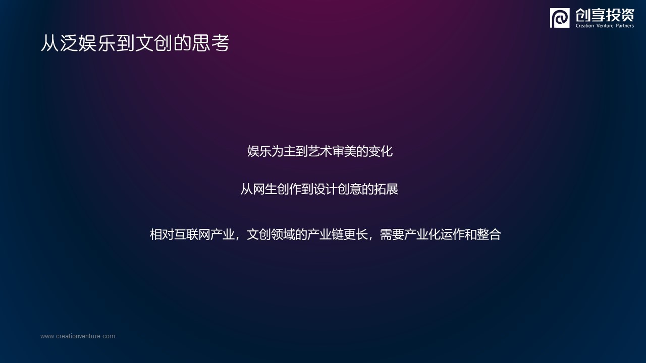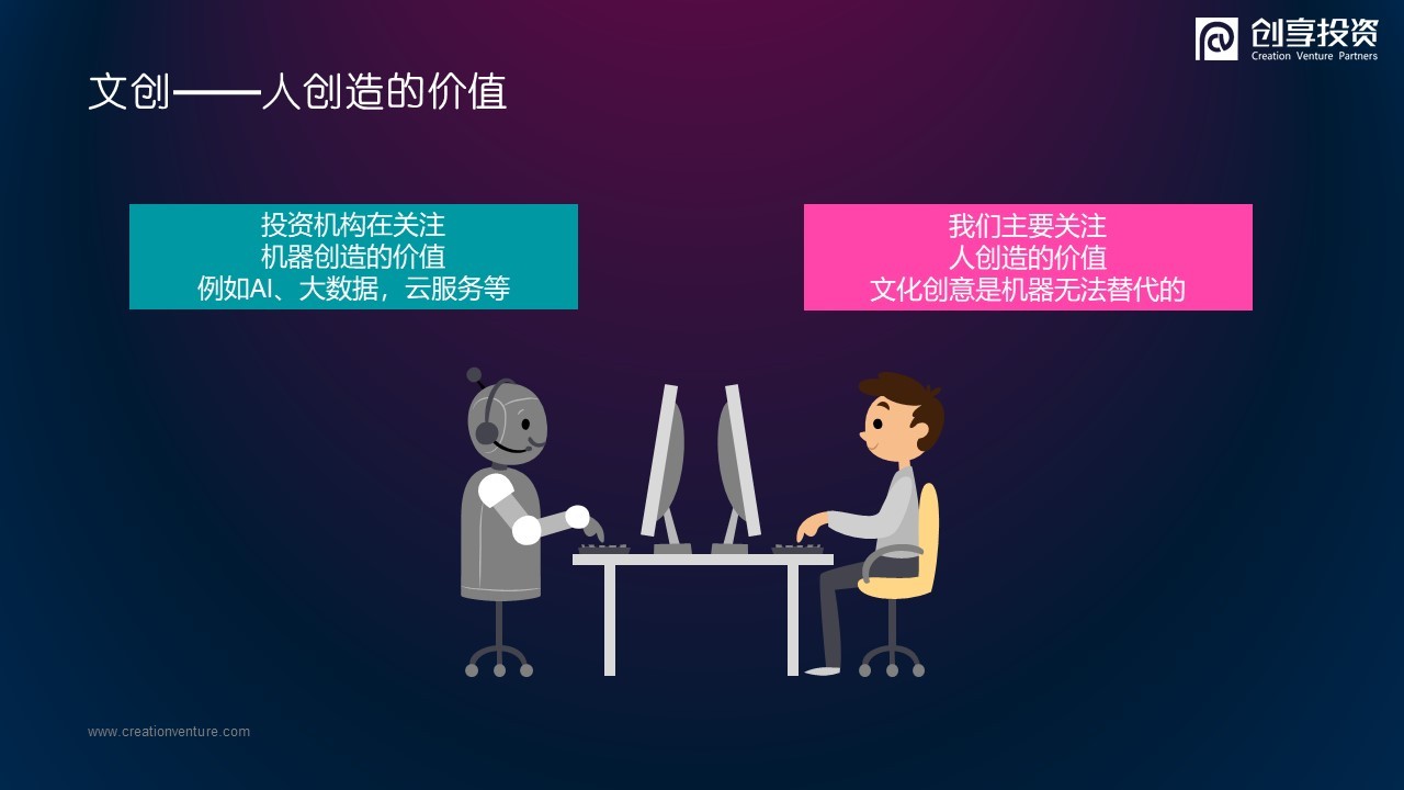 文创的核心是人创造的价值,目前很多同行投资机构在关注机器创造的价值,例如AI,大数据等,而我们创享主要关注的是人所创造得价值。