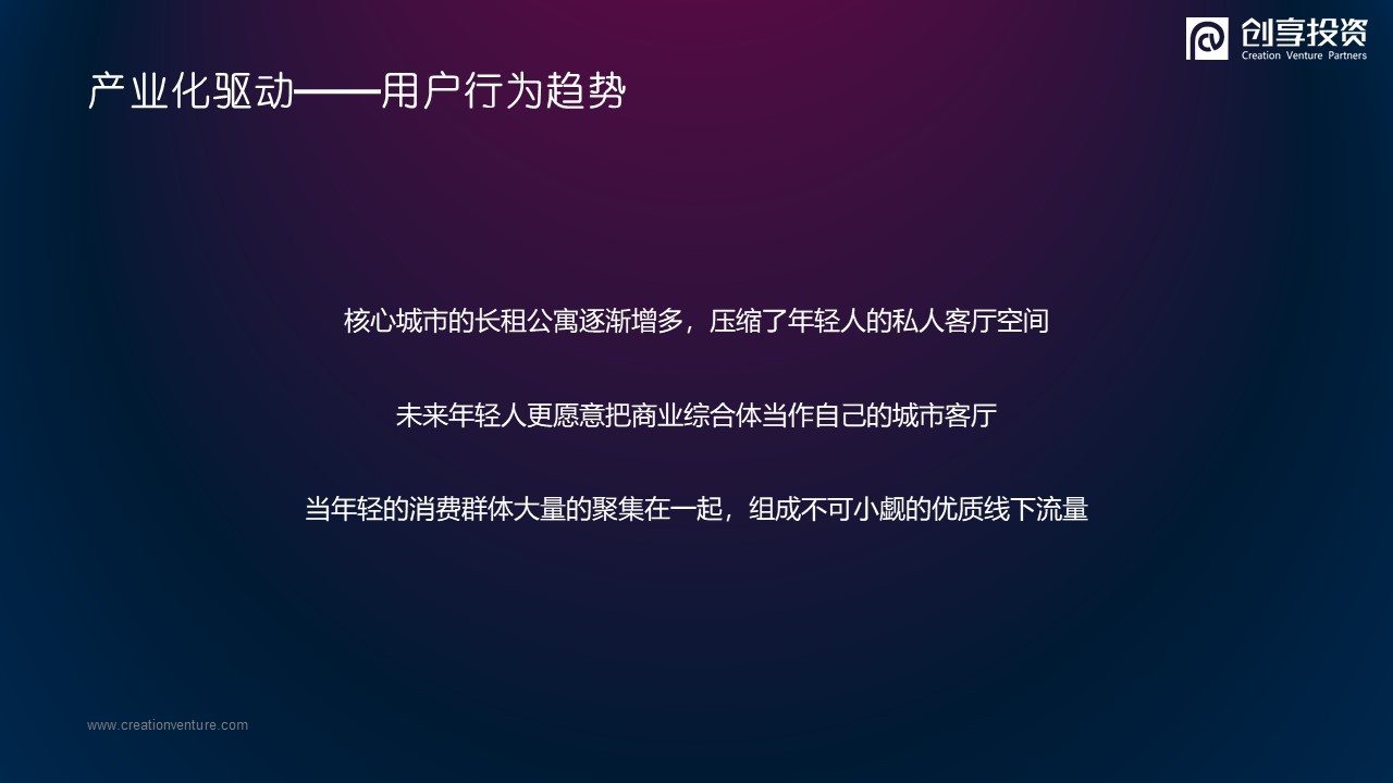 而产业化的驱动来自年轻消费群体行为趋势的变化上。 我们可以感觉到在例如北上广深等人口密集的一线城市,长租公寓的数量在快速的提升,但很多年轻人客厅的空间是在缩小。未来年轻人更愿意把商业综合体当作自己的“城市客厅”。