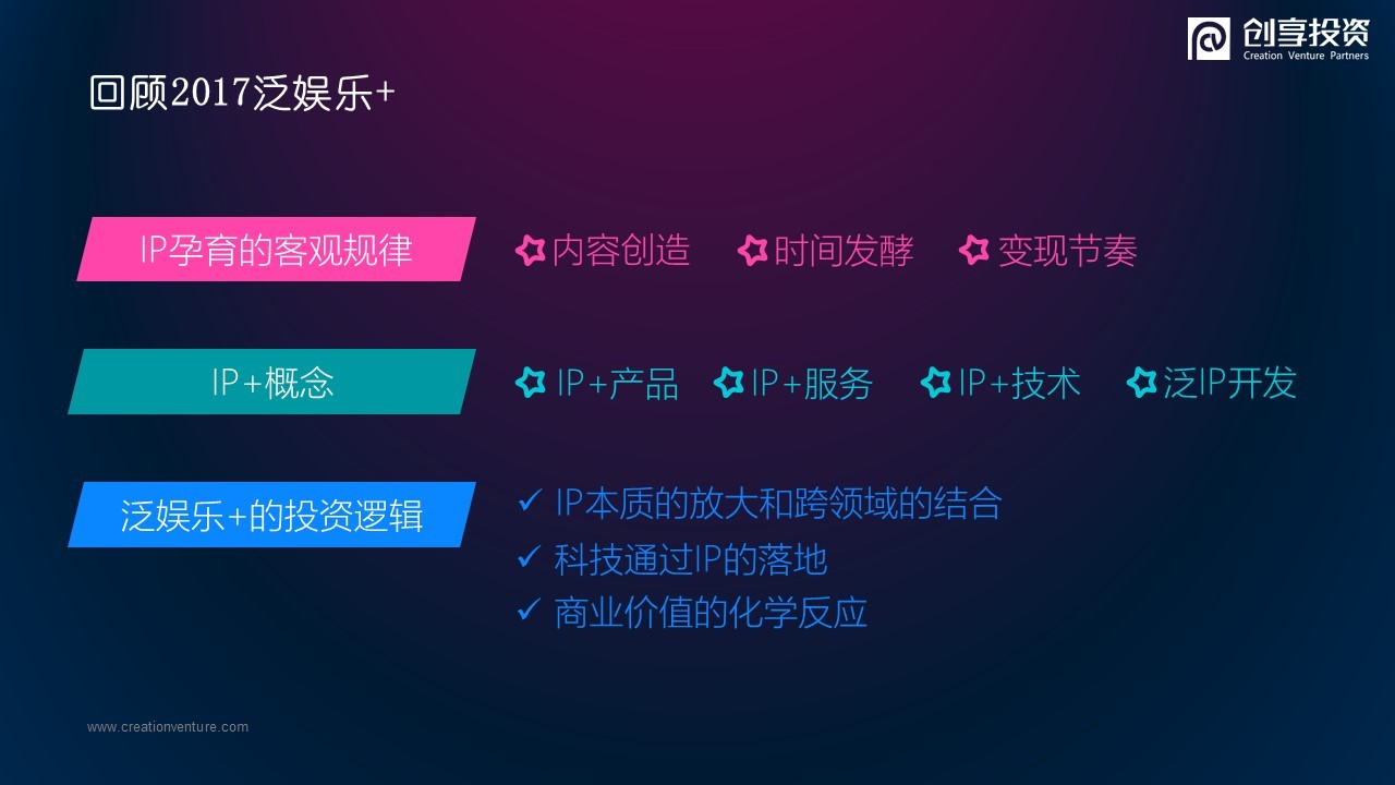 先回顾一下我们2017年三周年分享关于泛娱乐的内容,其中总结了IP孕育的客观规律,提出了IP+的概念,IP与产品、服务、技术的结合的衍生,最后总结提炼了泛娱乐+的投资逻辑。