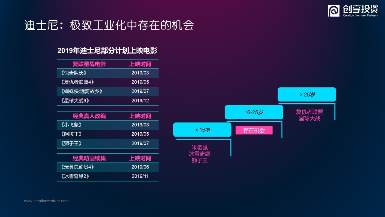 从迪士尼的出品可以发现,面对16岁以下迪士尼有全面的IP群,而对25岁以上也有一群超级英雄的IP内容,但是我认为在16-25岁这10年,迪士尼没有特别的IP形象或者内容。面对这个年龄群还是存在较大的机会。