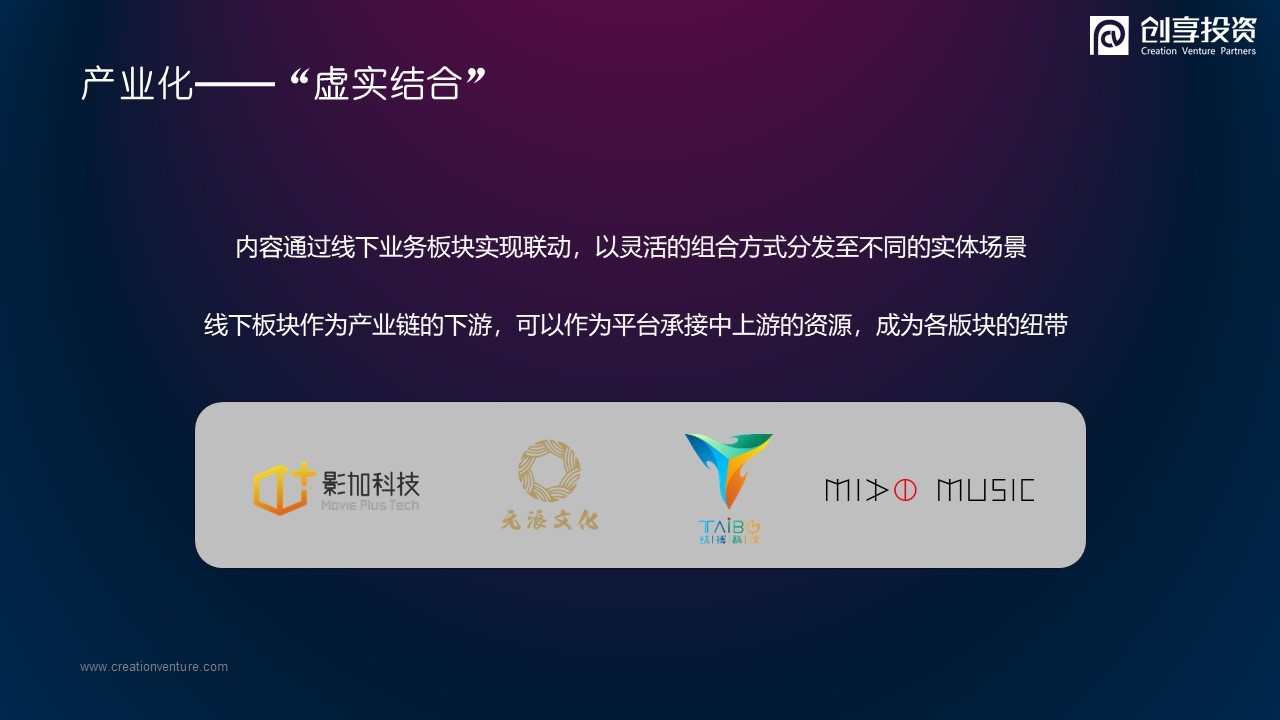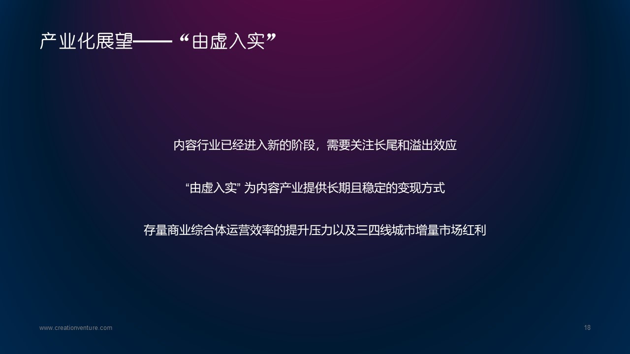 四年内,我们投资了大概50多家公司,其中一大部分的内容型公司。而当整体内容行业即将进入新的阶段,我们需要关注他们的长尾及溢出的效应。其次由虚入实的方式可以为内容产业提供长期且稳定的变现方式。再者,中国现实存在的客观情况,存量商业综合体存在运营效率提升的压力以及三四线城市增量市场的红利的特点。