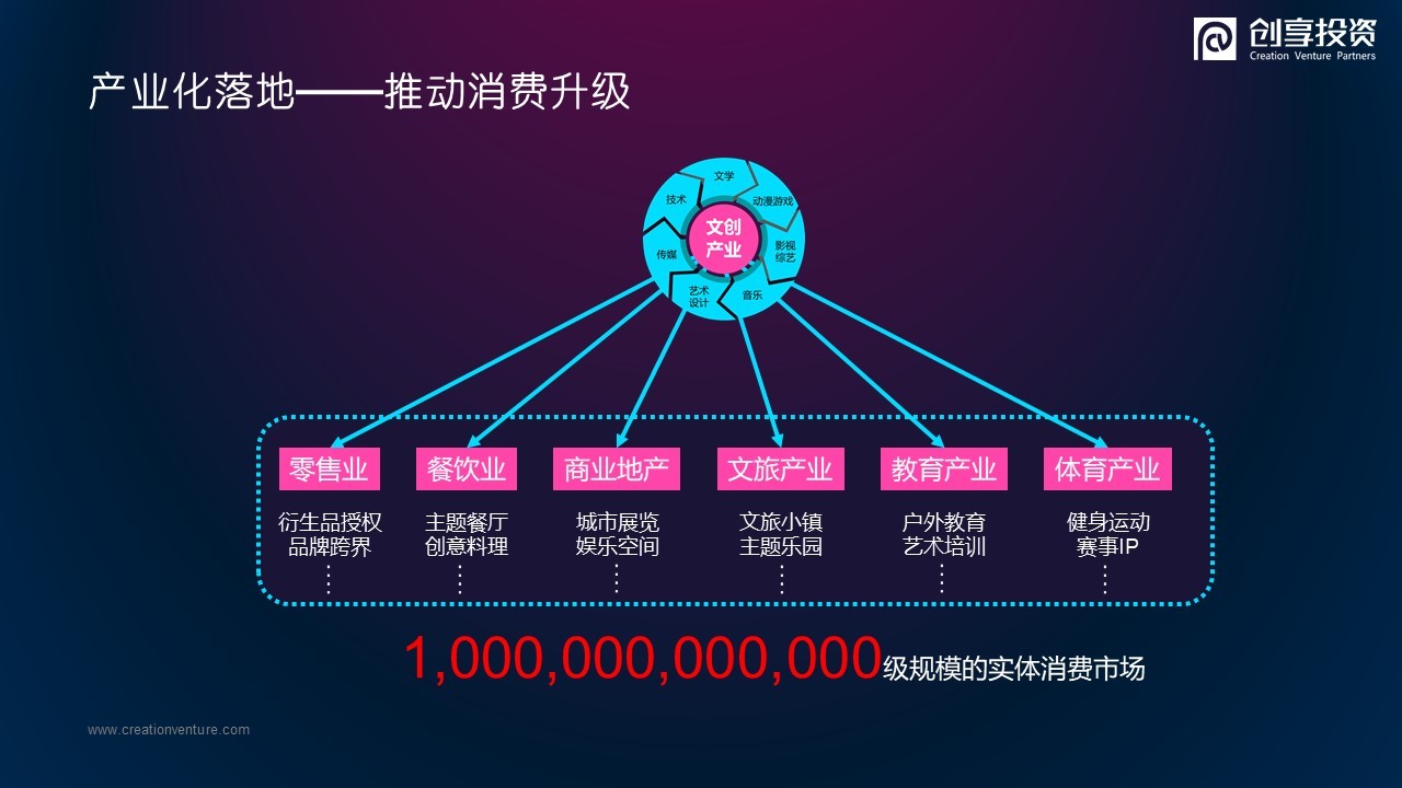 这是我们创享梳理的文创产业化布局,其中包括动漫游戏,影视综艺,互联网及硬件,传媒,艺术及教育,体育,零售及现场娱乐等。