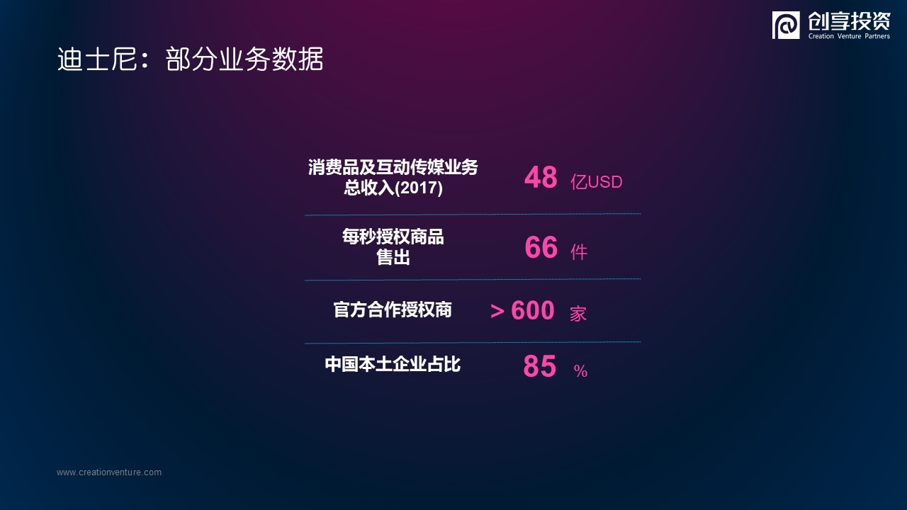 再看迪士尼部分具体数据,迪士尼消费品及互动传媒业务2017年总收入48亿美元,每秒有66件授权商品售出,有超过600家官方合作授权商,而且其中85%是中国本土企业。这些数据可以看出中国是有足够的产业链和市场渠道土壤。