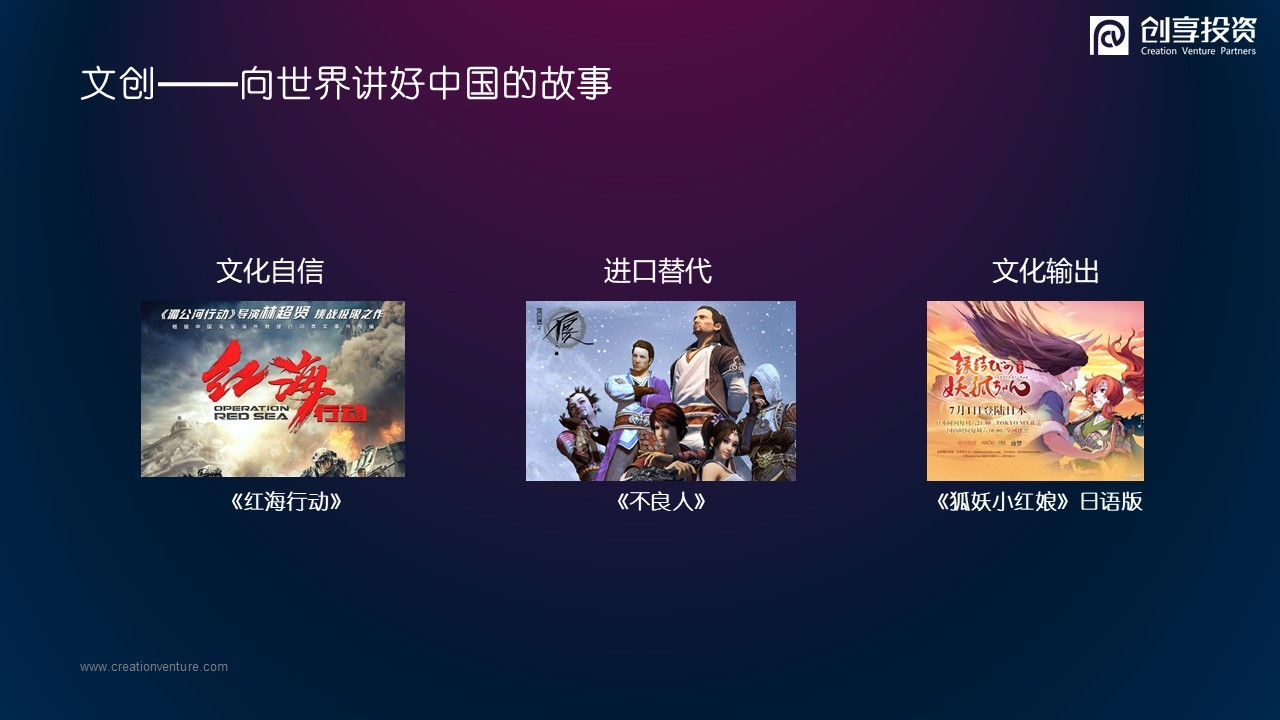 文创的精髓及正确价值观是“向世界讲好中国的故事”。首先是文化自信,这个我们持续两年提及,去年举的例子的是《战狼2》,今年则是《红海行动》;第二是进口替代,中国发展自己的原创内容作品;第三是文化输出,例如中国原创动画《狐妖小红娘》的日语版,而未来类似的中国文化出海将会越来越多。