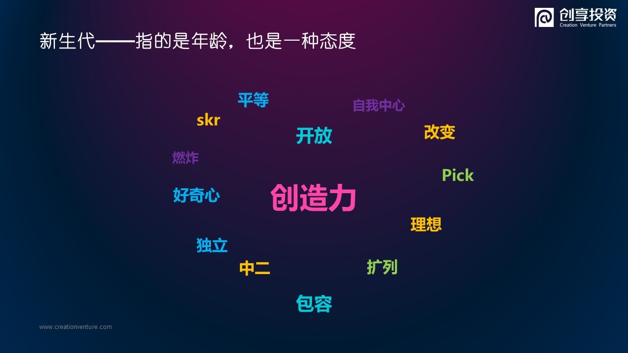 我们认为新生代远不止是年龄,也是一种态度。图中列了许多词,比如00后的专用术语“扩列”,90后的“中二”,还被广泛使用的“SKR”,“燃炸”等。但最核心的还是 “创造力”,年轻、新生代是一颗能一直保持开放有创造力的心。这也是我们创享希望可以一直做到的事。