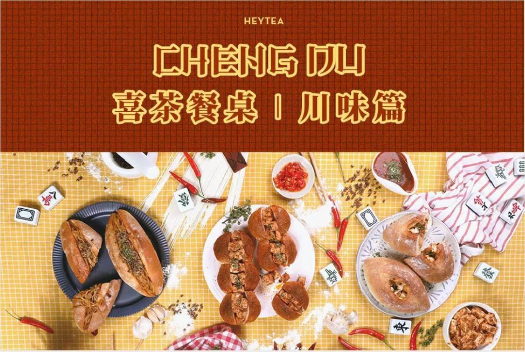 在一周前,川味包包提前在全国喜茶热麦门店上线,将口水鸡、麻婆豆腐、担担面等四川特色口味新品,配有地道的川氏风味的宣传海报,为成都店提前造势。